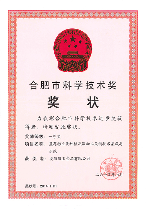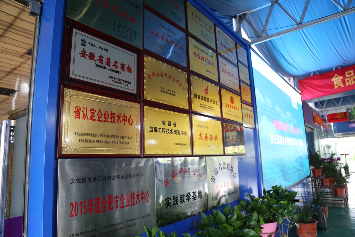 公司以科研院所為技術依托單位,并以政府政策為導向,大力發展特色精品農業、休閑觀光農業,先后在合肥與蕪湖建立了8個藍莓標準化種植基地,基地面積約4000余畝,直接受益農戶達3000多戶。并于2014年組建安徽省藍莓工程技術研究中心,主要從事藍莓種苗適生性篩選與新品種研究、標準化種植技術研究和藍莓精深加工產品的研發。良種‘徽王1號’、‘徽王2號’已通過主管部門認定;目前產品有藍莓干紅、果干、果汁、果醬、蜂蜜等。截止目前,公司制定國家標準1項、地方標準4項,獲授權發明專利19項,發表論文10余篇。